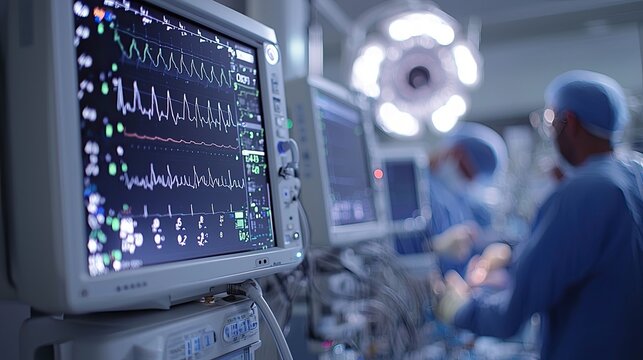 hospital monitors displaying vital signs, including heart rate, oxygen levels, and blood pressure. Represents the precision and urgency of medical care, life monitoring, and patient well-being