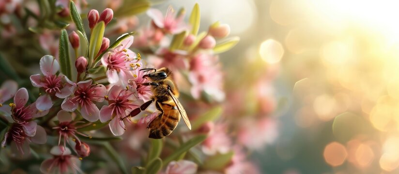 Manuka Flower with bee collecting nectar to produce medicinal Manuka Honey. with copy space image. Place for adding text or design