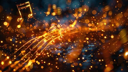 An enthralling image showcasing golden musical notes flowing on a dynamic background filled with sparkles, highlighting the excitement and vivacity of musical expression and creativity.
