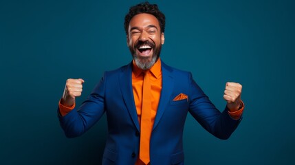 Happy ultra beauty businessman, exuding charisma, in a vibrant blue suit against a vivid orange backdrop, exuberantly showcasing success.