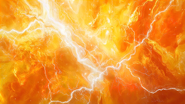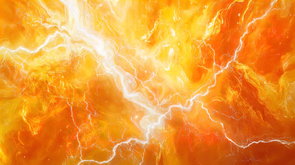 A vivid, abstract image dominated by bright orange and yellow hues with dynamic white streaks that resemble lightning bolts. The bright colors swirl and blend together in a fluid, energetic pattern, c