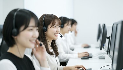 オフィスで並んでPC作業する複数の女性オペレーター