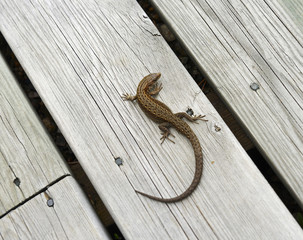Juvenile viviparous lizard, Zootoca vivipara, basking on the duckboard in Finland