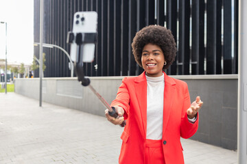 Confident woman in red suit recording video on city street