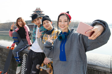 Tourists taking photos and streaming live at taxi station