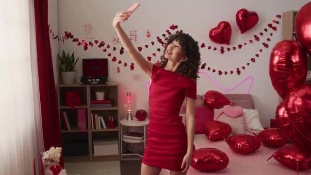 Zoom in view of positive curly-haired girl in elegant dress filming selfie video using smartphone in festive room prepared for Valentines day celebration