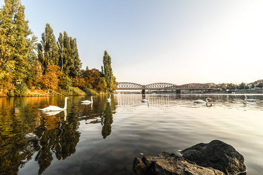 Czechia, Prague, view to Vltava with railway bridge in the background
