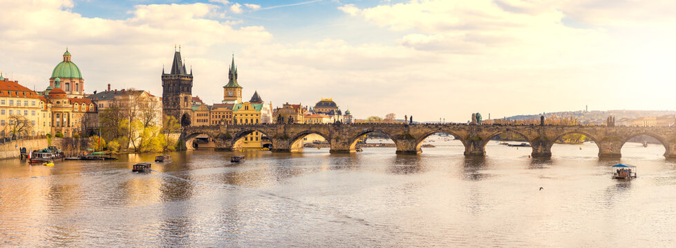 Charles Bridge over Vltava river and architecture of the Old Town in Prague, Czech republic. Pleasure ship on the Vltava river in Prague. Charles Bridge the main attraction of Prague in Czech republic