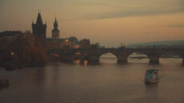 landscape with Vltava river, Karlov most and boat at sunset in autumn in Prague, Czech Republic.