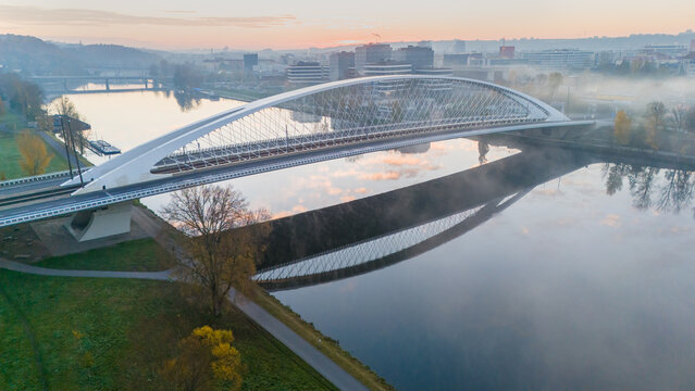 Troja Bridge in Prague. The new and modern Troja Bridge over the Vltava River in Holešovice, Prague, Czech Republic. A bridge for cars and trams in the center of historic Prague.