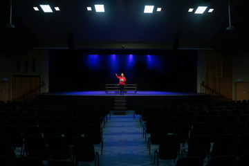 Singer at microphone. Woman singing and holding mic. Female vocal talent. Music show recital.
