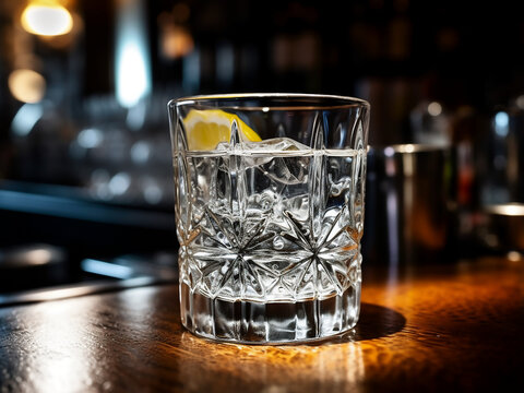 Crystal-clear vodka in a shot glass. AI Generation.