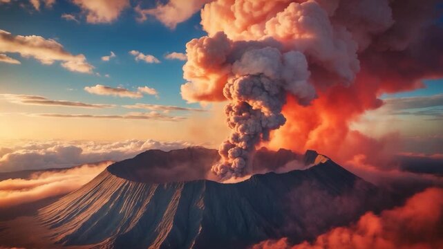 Erupting volcano spewing volcanic ash and smoke against a colorful sunset sky showcasing dramatic cloud formations glowing warm colors and the rugged terrain of the volcano's crater and slopes.