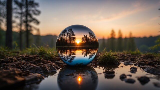reflective glass sphere with forest landscape accentuated by a beautiful sunrise.