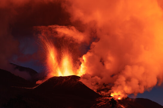 A dramatic image captures a volcano erupting, with molten lava cascading down its slopes against a backdrop of dark clouds, illustrating nature's raw power and beauty.