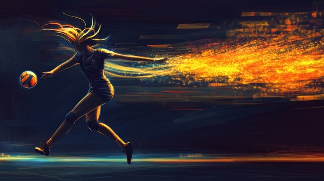 A female volleyball player with long blonde hair in mid-jump with a ball in her hand, streaks of light trail behind her.