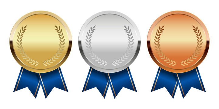 Golden silver and bronze award medal with ribbons for sport and games