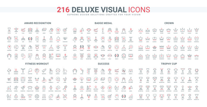 Success achievement trophy, gold cup and crown, medal line icon set. Different prizes, diploma and money rewarding victory, sport triumph thin black and red outline symbols vector illustration