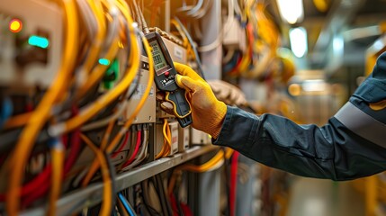 Electrician engineer work tester measuring voltage and current of power electric line in electical cabinet control , concept check the operation of the electrical system .