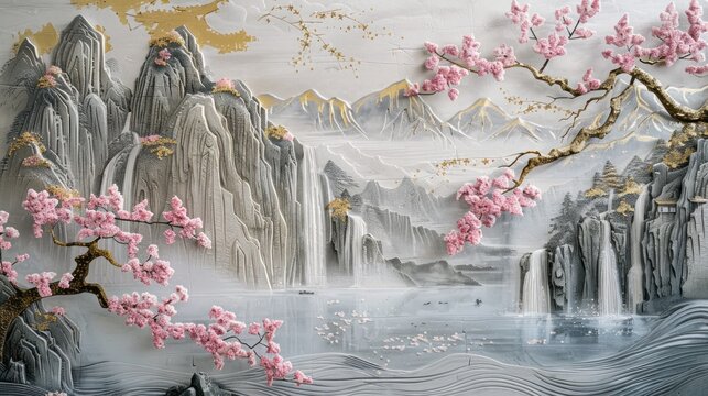 The concrete wall is adorned with volumetric stucco molding featuring golden elements, depicting a serene Japanese landscape complete with waterfalls, mountains, and blossoming sakura trees.