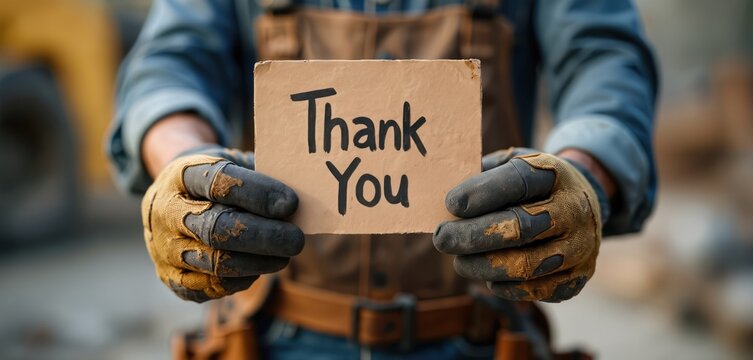 Caucasian male worker holds Thank You sign with gloves. Worker shows appreciation for construction. Gritty hands construction site. Manual labor gratitude acknowledgment hard work.