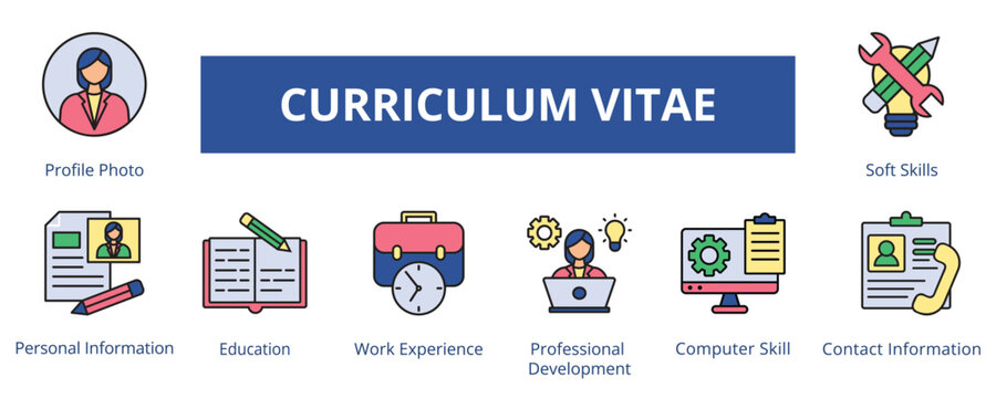 Curriculum Vitae Lineal Color Banner Web Icon Set Vector Illustration, Profile Photo Personal Information Education Work Experience Professional Development Computer Skill Contact Soft Skills