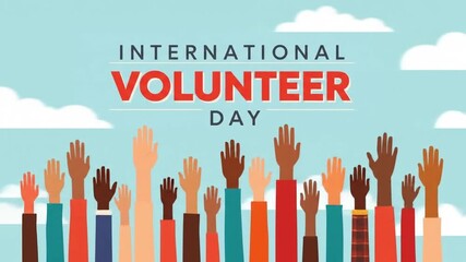 Colorful illustration celebrating International Volunteer Day with diverse hands raised against a blue sky