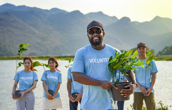 Four enthusiastic volunteers in red “Volunteer” shirts smile as they collaborate in a sunlit community gardening event, promoting teamwork and environmental care