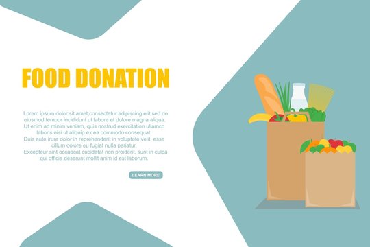 Food drive charity concept. Box with natural and organic products. Online shopping and fast delivery, transportation. Charitable donaton of eating. Care and support. Cartoon flat vector illustration