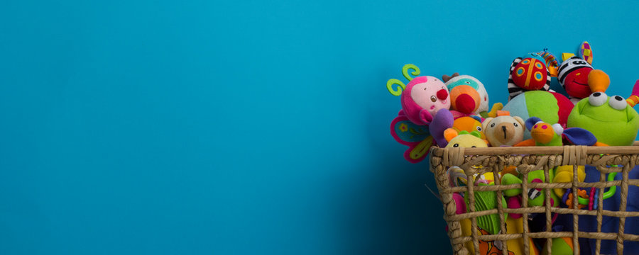 Toys collection in box on abstract wooden background. Donatation. Copy space for text