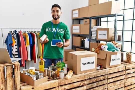 Young arab man wearing volunteer uniform using touchpad at charity center