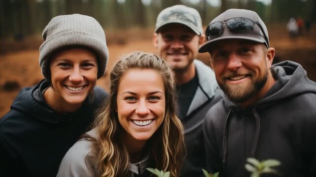 Friends gather in a forest to plant young trees as part of a community conservation effort. They show joy and teamwork while contributing to environmental health