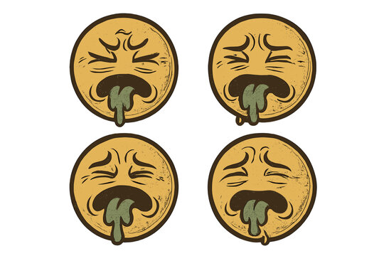 Grossed out emoticon set. Vintage retro smiley face collection. Disgusted emoji icon pack with puke and vomit expression. Nausea, sick, barf feeling concept illustration.