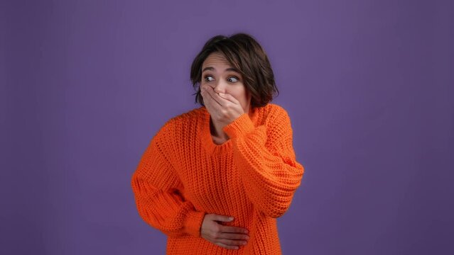 Lady drunk suffer belly infection vomit isolated dark vibrant color background