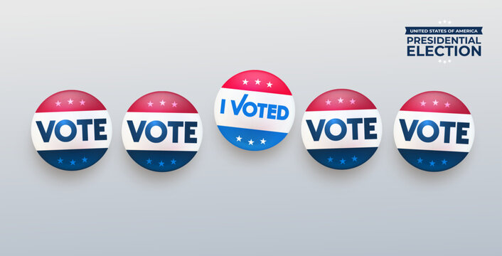 2024 Presidential election, red, blue and white vote vector buttons. Vote, i voted, various badges in American style, color and design. I voted badge isolated on white background. Vector illustration.