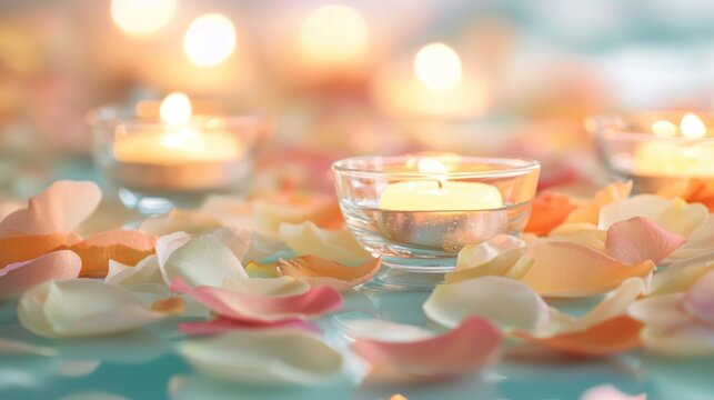 Soft pastel-colored flower petals scattered across the table, paired with small votive candles for an elegant touch.