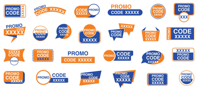 promo code and discount label set, blue and orange banners, tags and stickers for ecommerce, retail and special offer marketing promotions