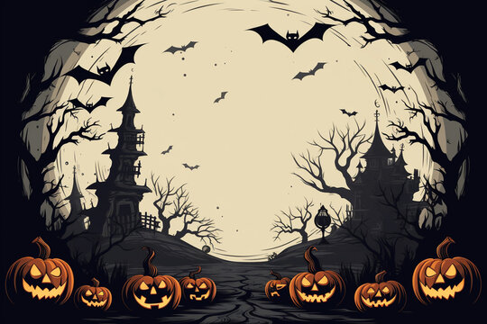 Halloween background.  Wallpaper spooky nighttime scene horizontal. AI generated
