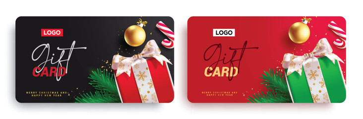 Christmas gift card vector set design. Merry christmas and happy new year greeting for holiday gift cards vouchers collection. Vector illustration shopping voucher certificate.
