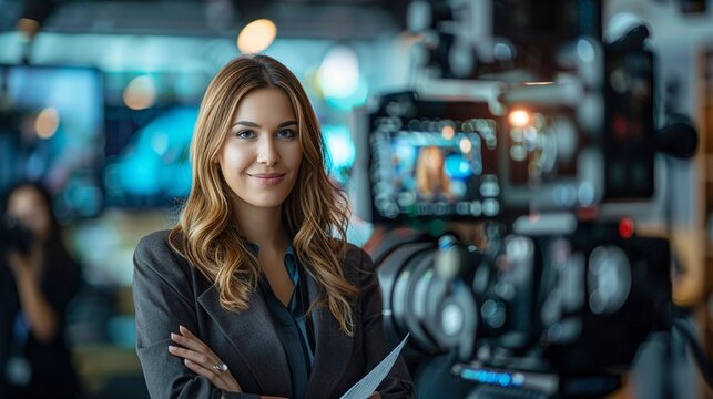 Broadcast journalist in front of a camera, reporting live, holding notes, background blur, high resolution, photorealistic, detailed 8K , high-resolution, ultra HD,up32K HD