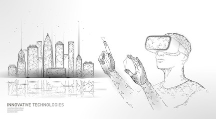 Low poly smart city intelligent building automation. VR helmet augmented reality visualize creation concept. Architecture urban cityscape technology sketch banner vector illustration