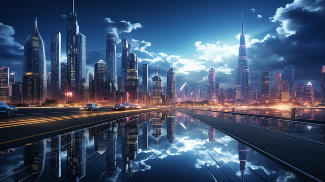 Futuristic cityscape with towering skyscrapers and neon lights, Digital background Generative AI