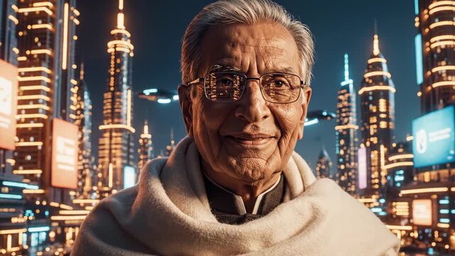 Senior asian man smiling with futuristic cityscape background in virtual reality video