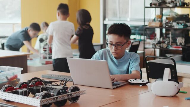 Schoolboy coding on a laptop sitting at the desktop with a joystick, VR headset and chassis of a moving robot in a class at a robotics lesson. Concept of technological modern education