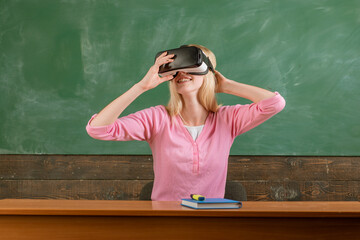 Surprised schoolchildren using 3d vr glasses at lesson in elementary school