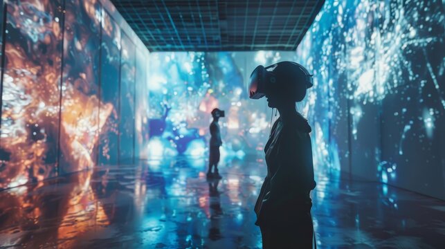 Virtual reality art gallery with immersive digital exhibits, visitors wearing VR headsets and exploring digital artworks