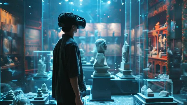 Man Using VR Headset in a Historical Museum Filled with Ancient Artifacts
