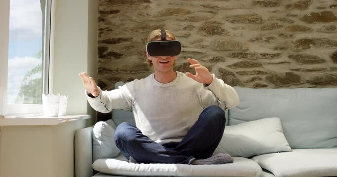 Virtual reality, glasses and man on sofa with gaming user experience, cyber vision and metaverse at home on future technology. 3D, vr video games and gamer experience on high tech in his living room