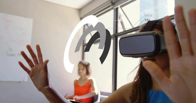 Woman putting on VR headset and manipulating concentric rings, refining gestures for tech test