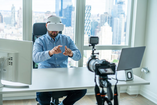 Man working in VR goggles in front of camera